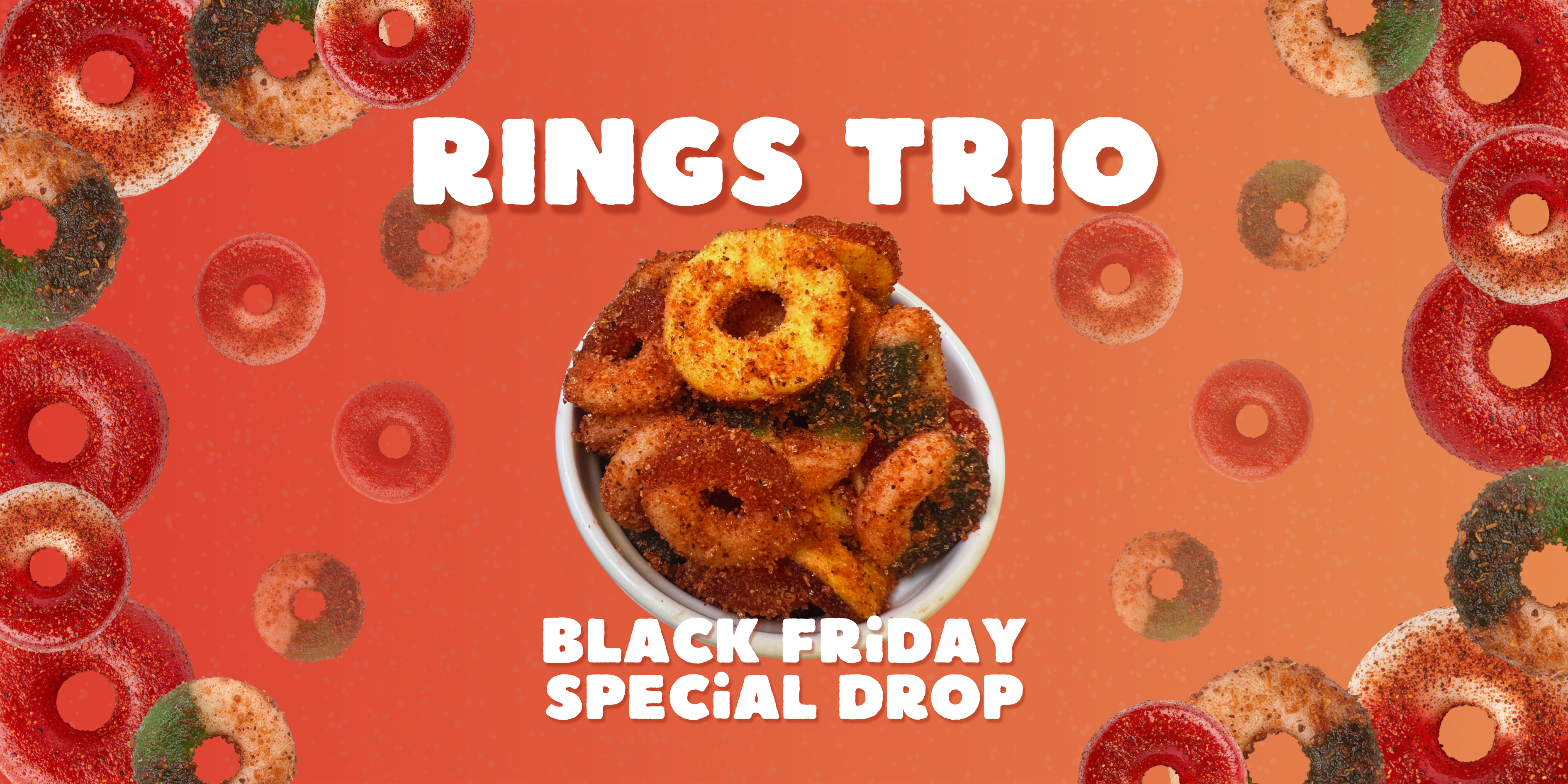A limited-edition 16 oz Black Friday blend featuring our three bestselling rings: Apple, Watermelon, and Peach. All drenched in Chamoy Hauss’ signature Chili mix & chamoy.